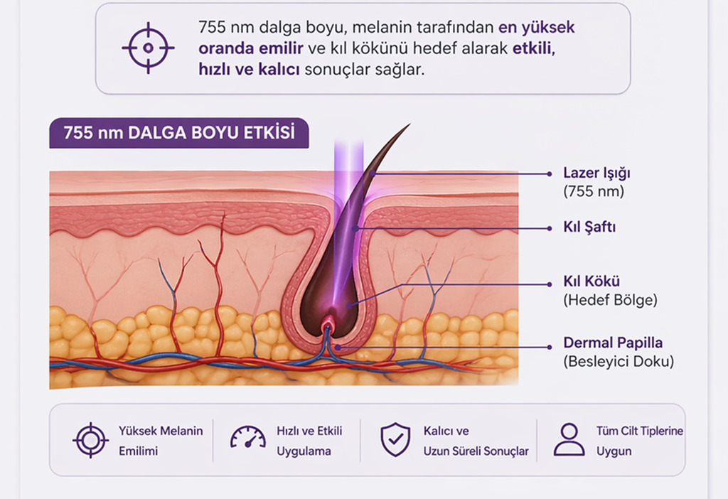 Alexandrite, 755nm nm dalga boyuna sahiptir. Bu dalga boyu, melanine (kıla renk veren madde) çok yüksek bir tutulum gösterir.