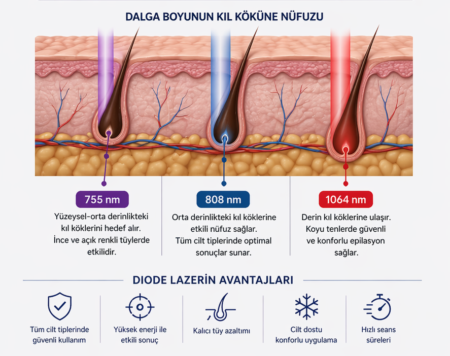 Diode lazerler 808nm-810nm dalga boyları ile çalışır ve farklı cilt tiplerine uyum sağlayabilen en esnek sistemlerden biridir. Bu dalga boyu, Alexandrite’a göre daha derine, kıl folikülünün tam merkezine ulaşır. Hem açık hem de buğday tenli kişilerde kullanılabilir. Daha derin kıl köklerine etki ettiği için özellikle kalın ve dirençli kıllarda başarılı sonuç verir.